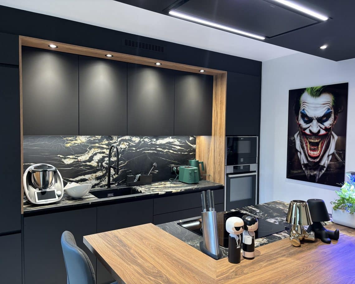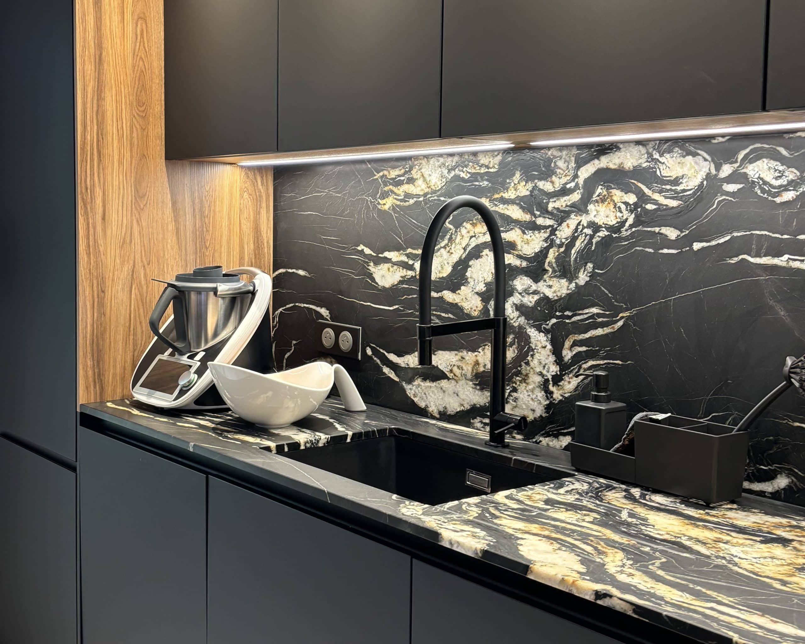 Réalisation d'une cuisine sur-mesure à Plabennec : coloris noires mates (sans poignées) et plan de travail en granit belvédère finition cuir. La cuisine est équipé d'un évier noir et mitigeur noir de chez Bradano.