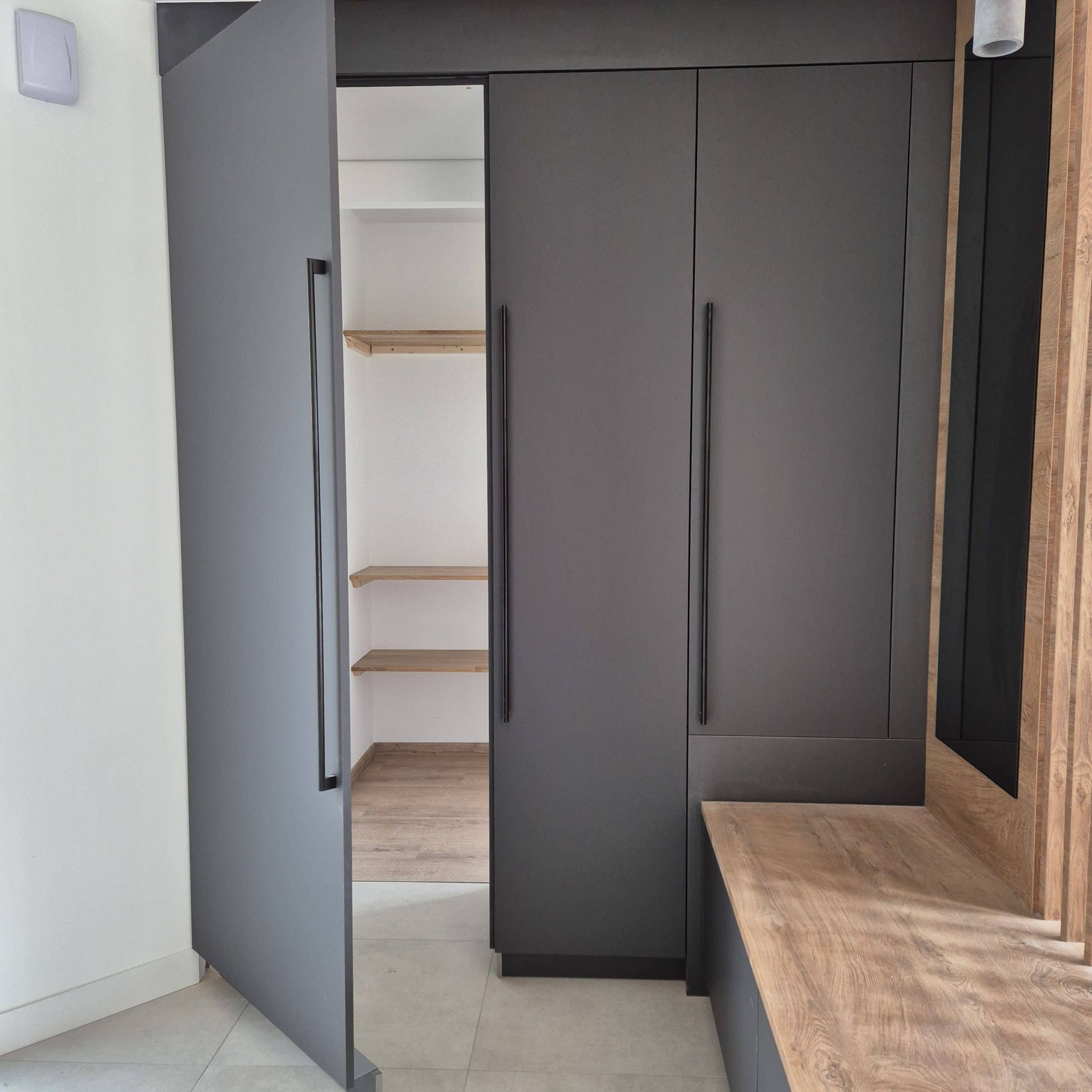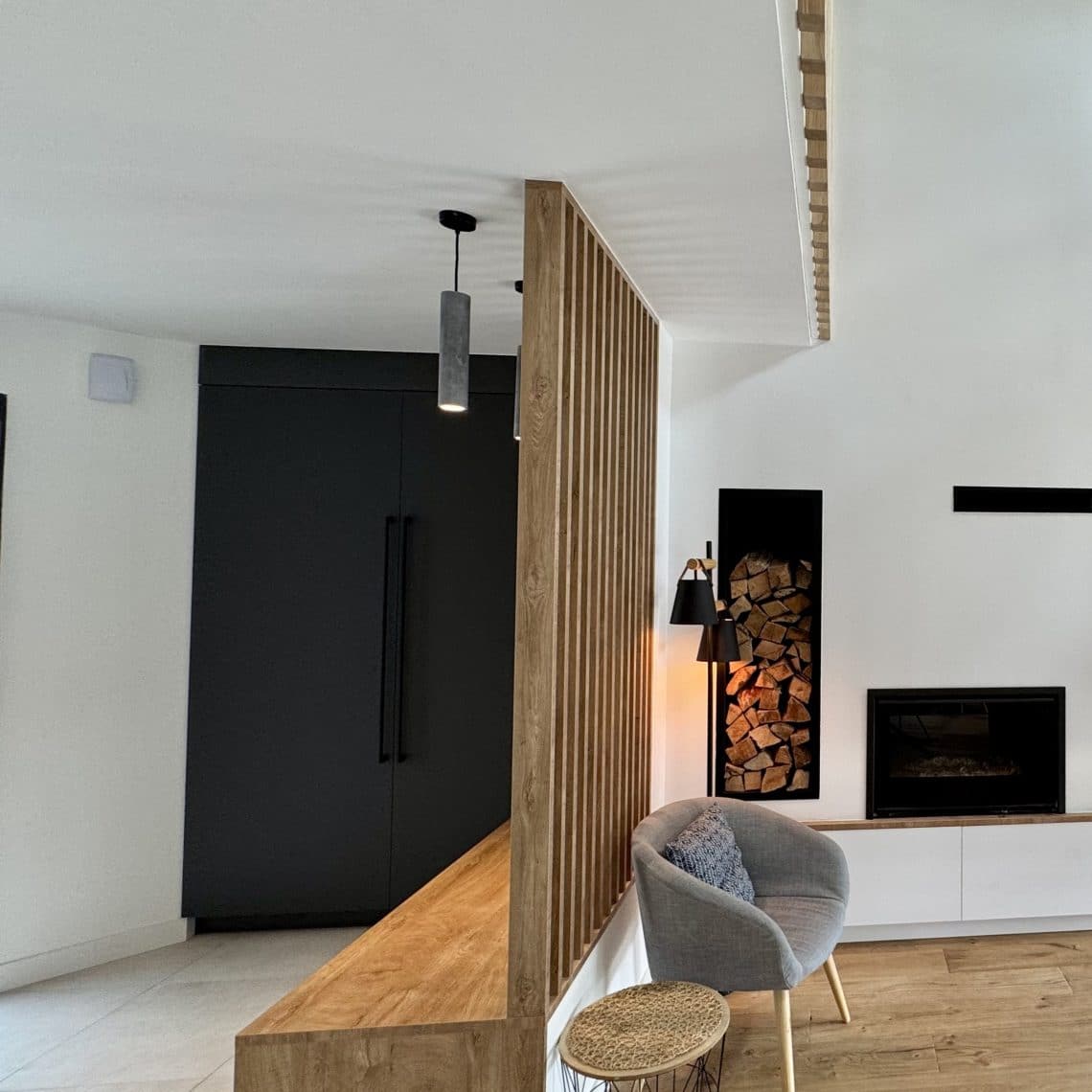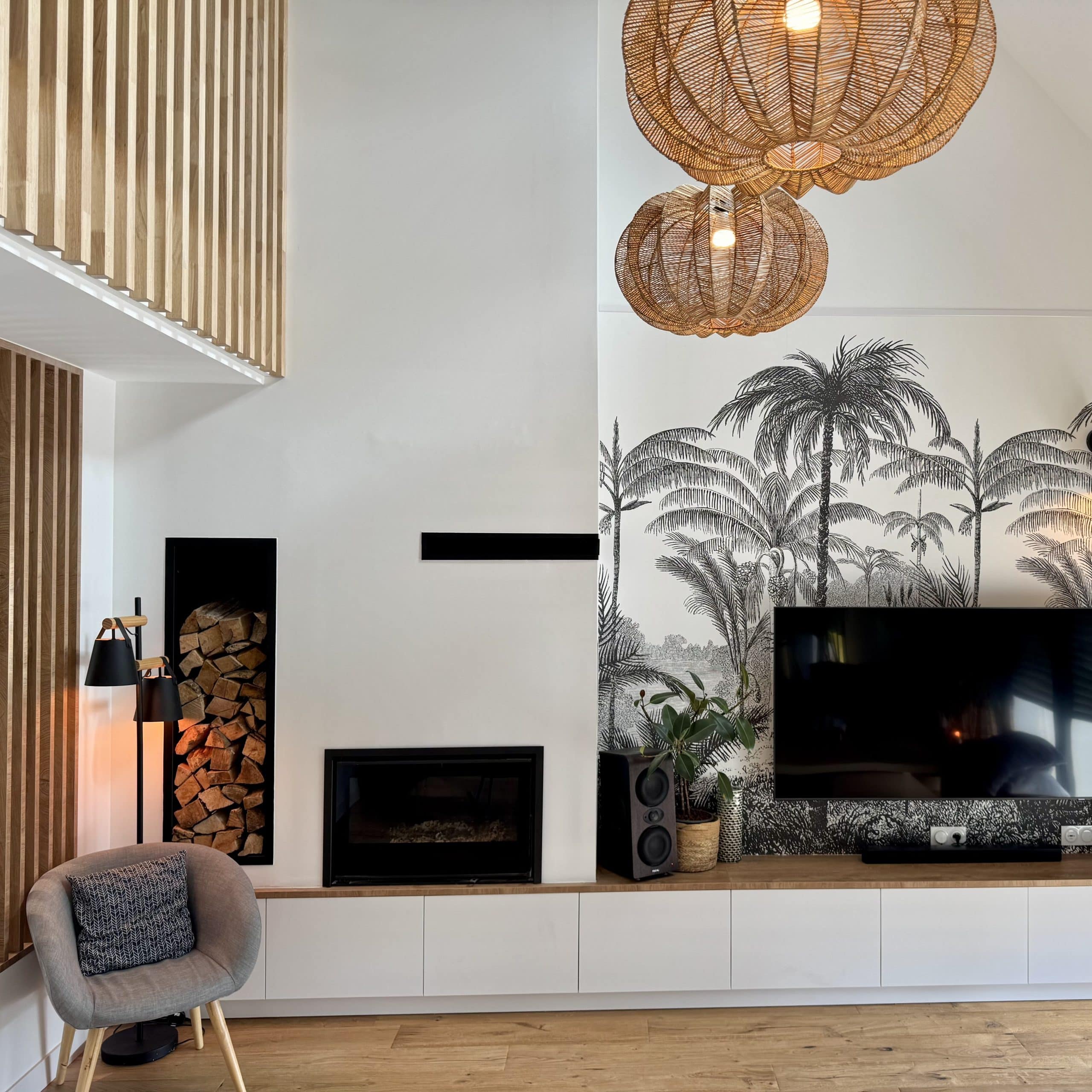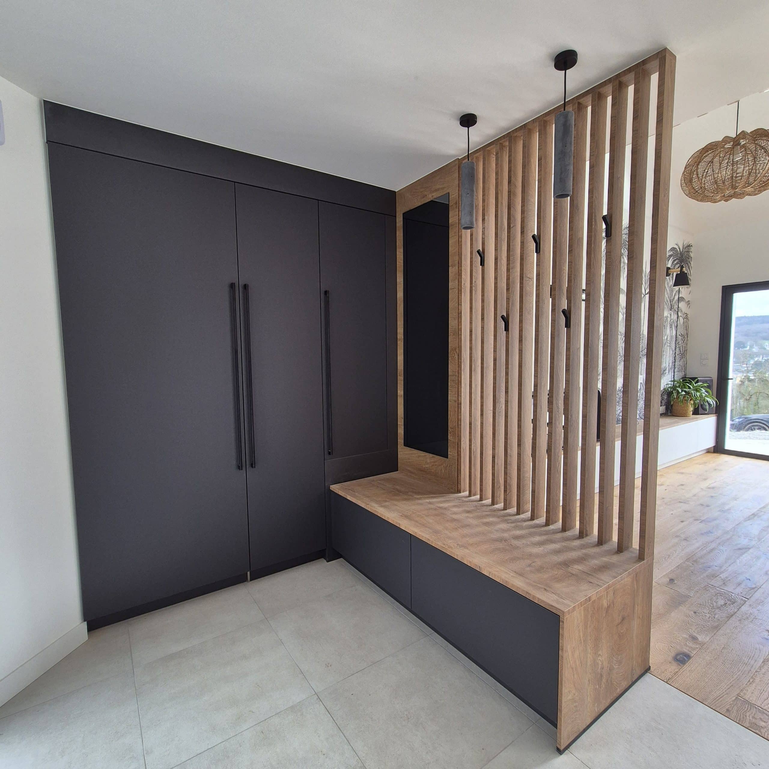 Réalisation d’un meuble d’entrée graphite mate et d’une porte de passage avec poignées noires, un meuble télévision blanc cristal et chêne bois de bout avec beaucoup de rangement en pousse-lâche, le tout séparé par un claustra bois et d’un miroir tinté gris.