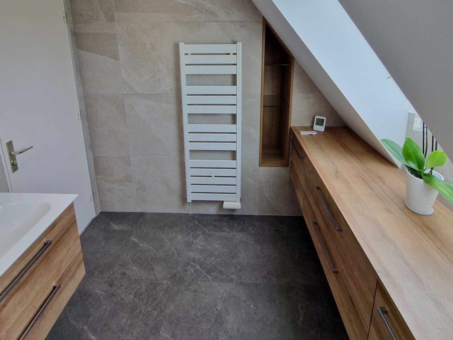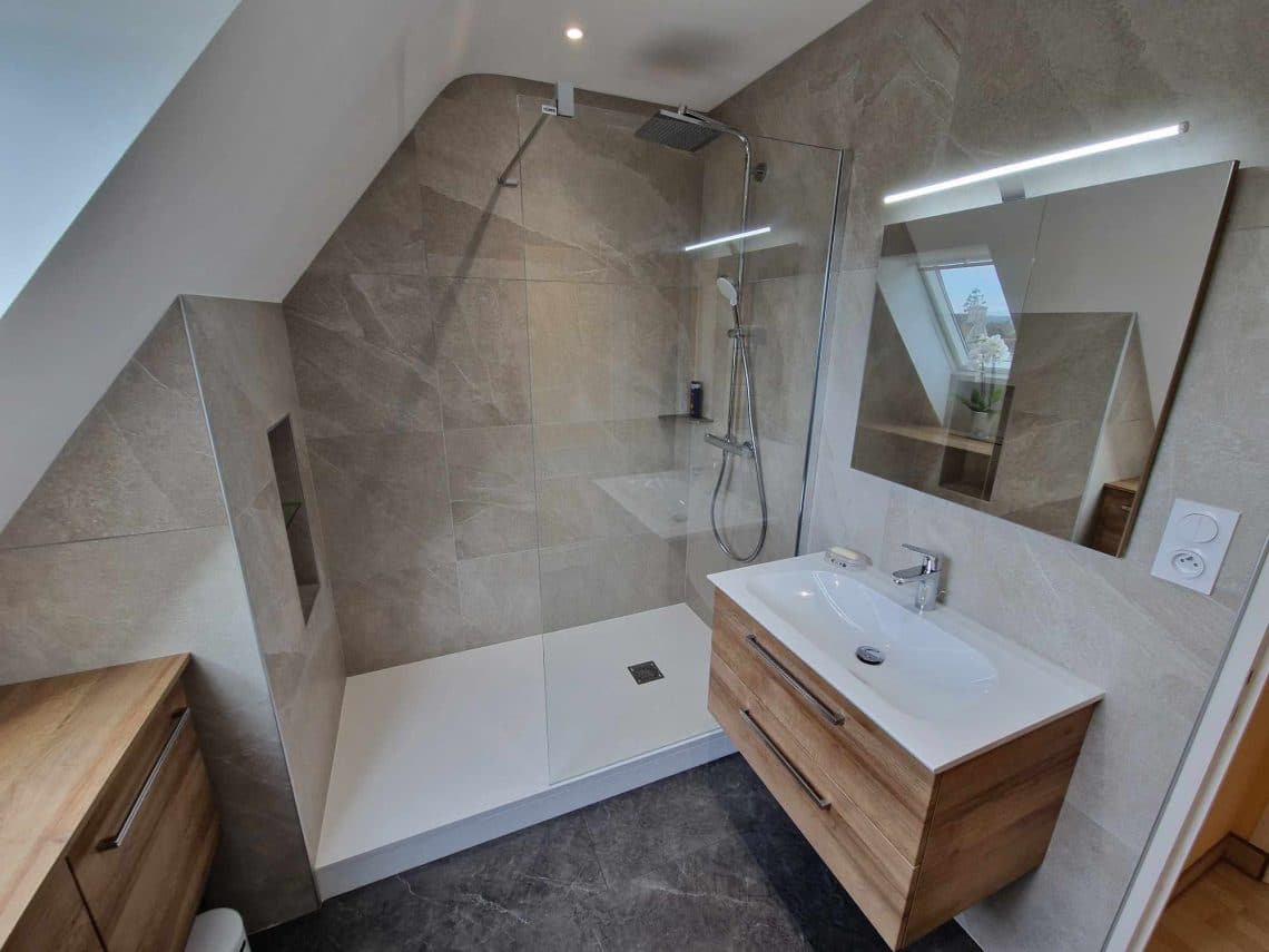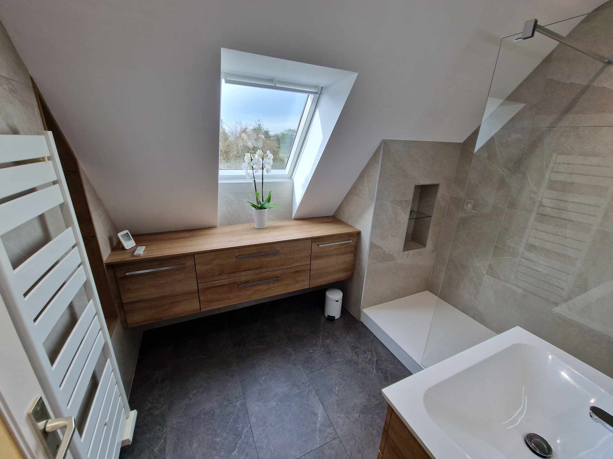 Réalisation salle de bains avec les façades en finition chêne riviera et le plan vasque en marbre blanc reconstitué. La salle de bains est équipé d'un mitigeur et d'un thermostatique de chez Hansgrohe, d'un receveur Mcbath, d'une paroi de douche Huppe et d'un sèche serviette Acova.